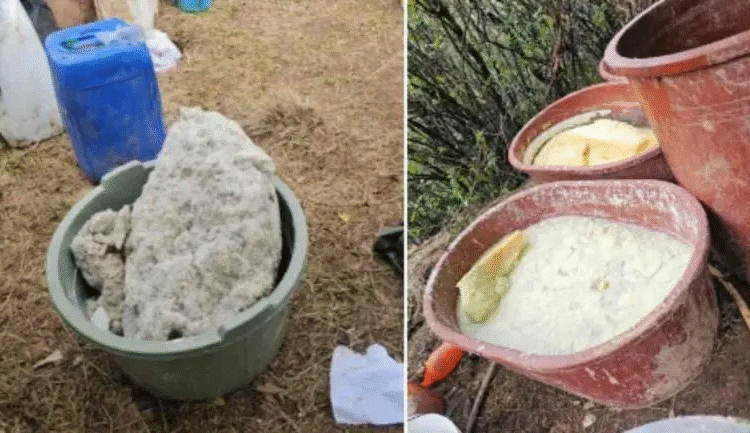 Ante esta situación, personal federal y estatal se trasladó al sitio, donde localizaron utensilios, bidones y contenedores plásticos con diversas sustancias aún no identificadas, así como reactores empleados en la elaboración de drogas, costales y precursores químicos.
