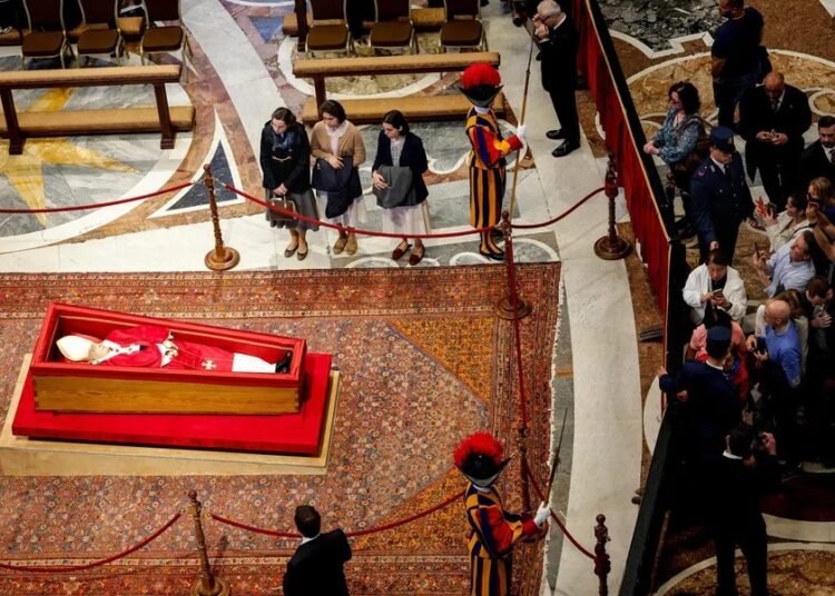 El féretro fue colocado frente a la tumba de San Pedro, enfrente del imponente baldaquino de Bernini, y se ha acordonado la zona para que las personas se sitúen a una determinada distancia.