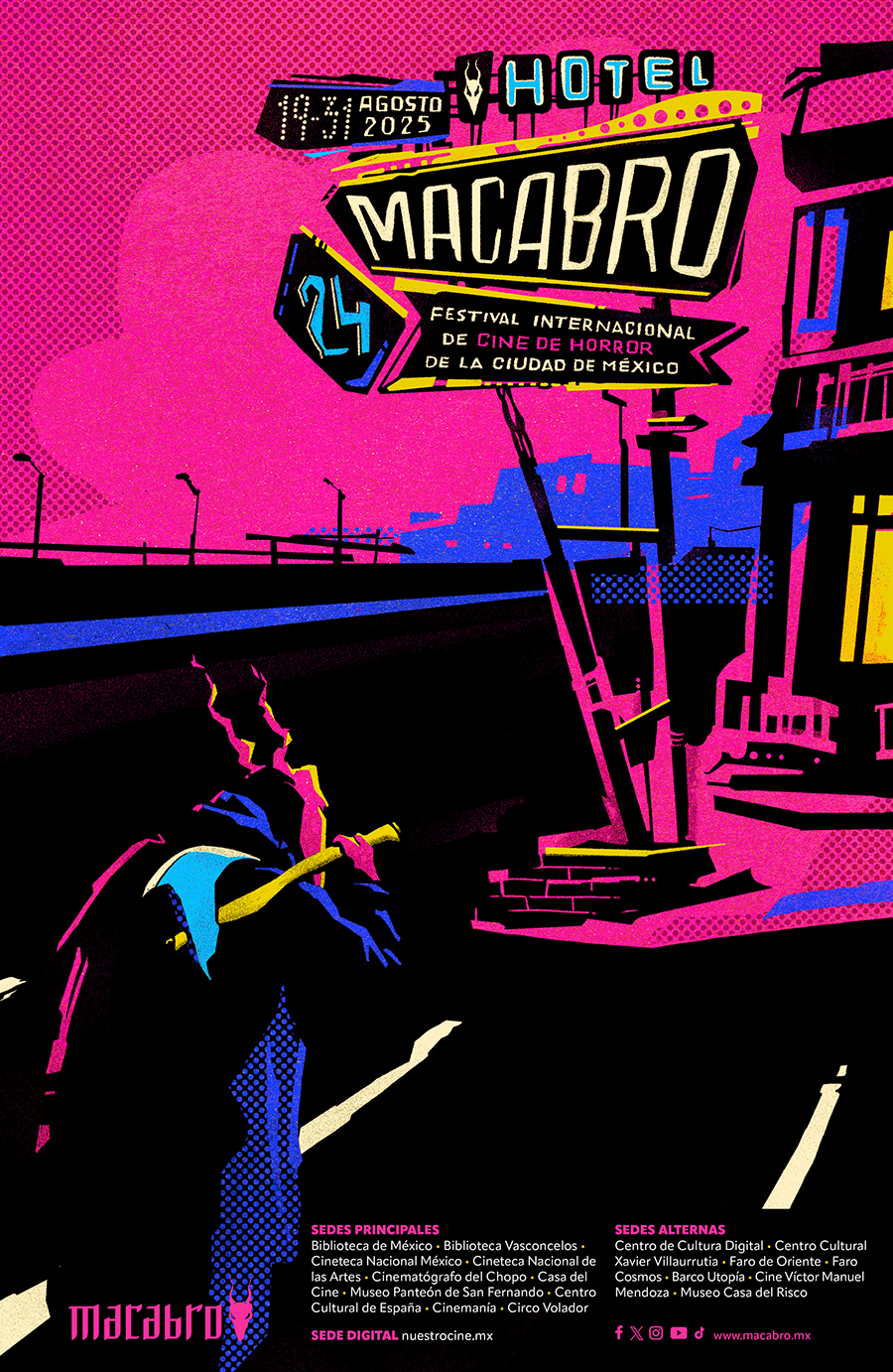 Ciudad de México, 05 junio del 2025.- Como ya es tradición, MACABRO, el Festival Internacional de Cine de Horror de la Ciudad de México, revela el cartel de su edición número XXIV. Este año, el festival invita al público a adentrarse en un universo de pasillos oscuros e inquietantes, habitaciones espeluznantes y seres de ultratumba: bienvenidas y bienvenidos al Hotel Macabro.